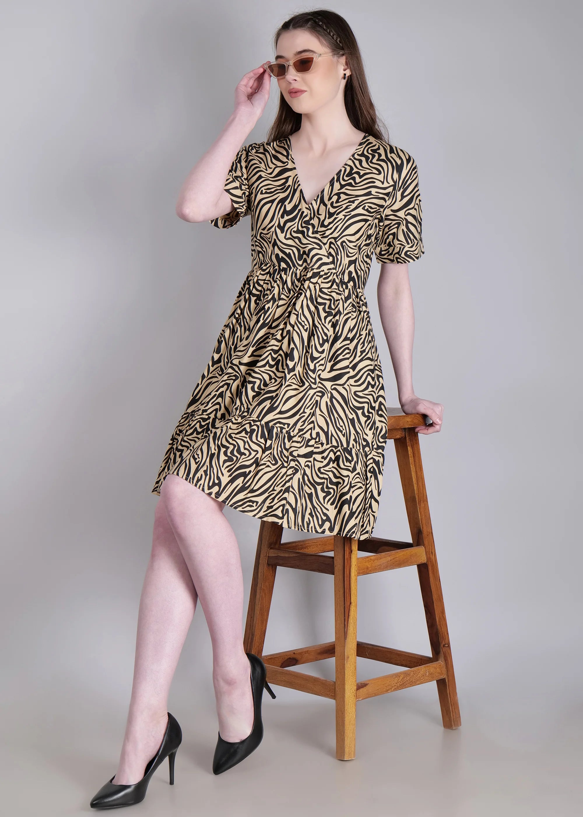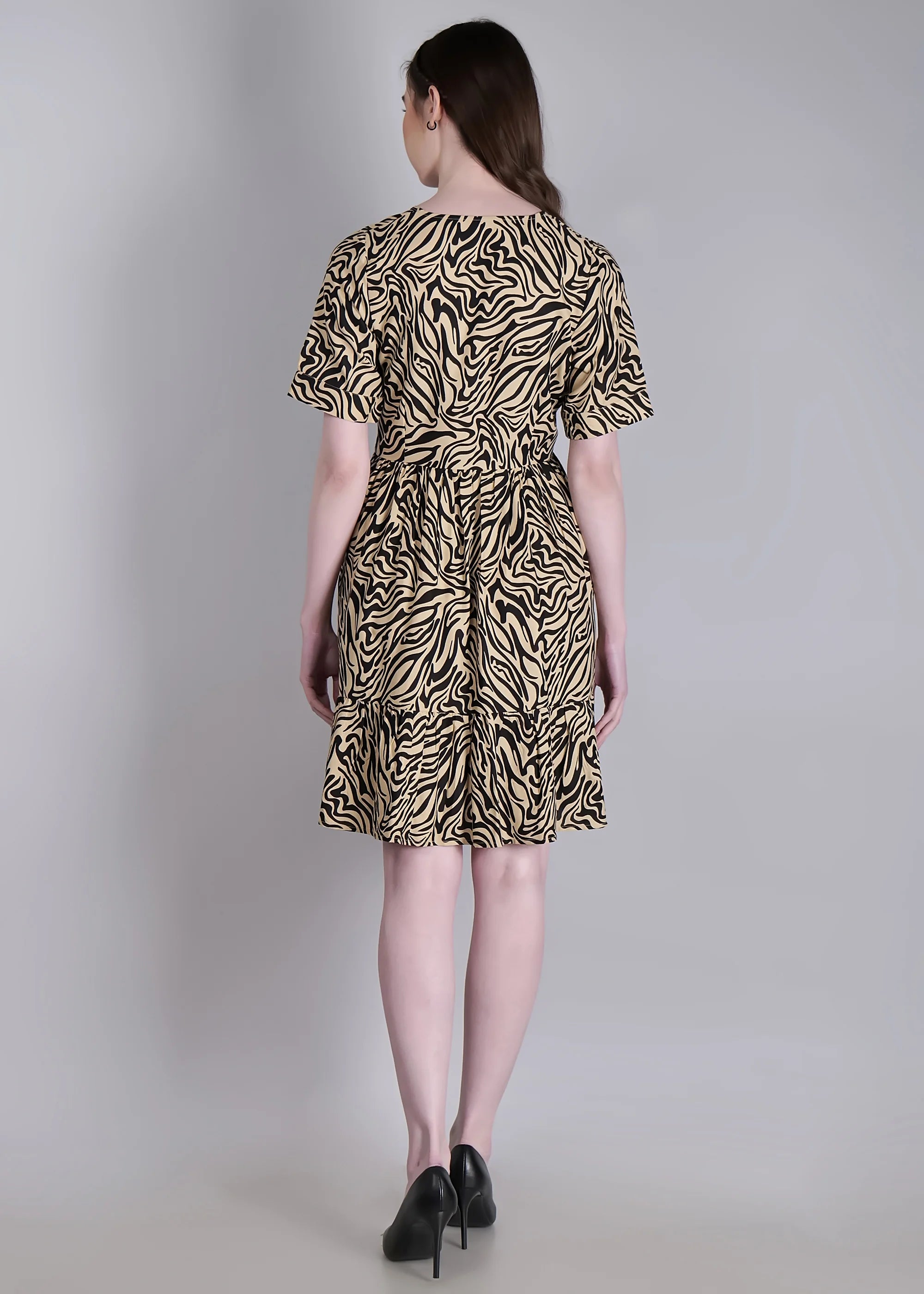 WOMEN'S BEIGE ZEBRA PRINT MINI FLARED RAYON DRESS