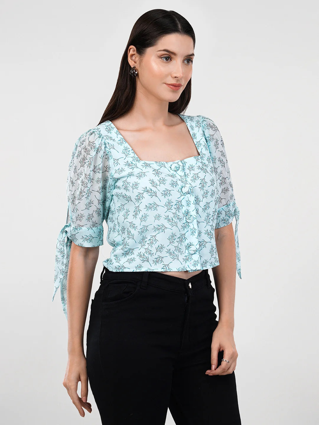 "SQUARE NECKLINE, PUFF SLEEVES, KNOT ELBOW LENGTH SLEEVES, FABRIC BUTTONED PLACKET, CROP TOP, GEORGETTE"