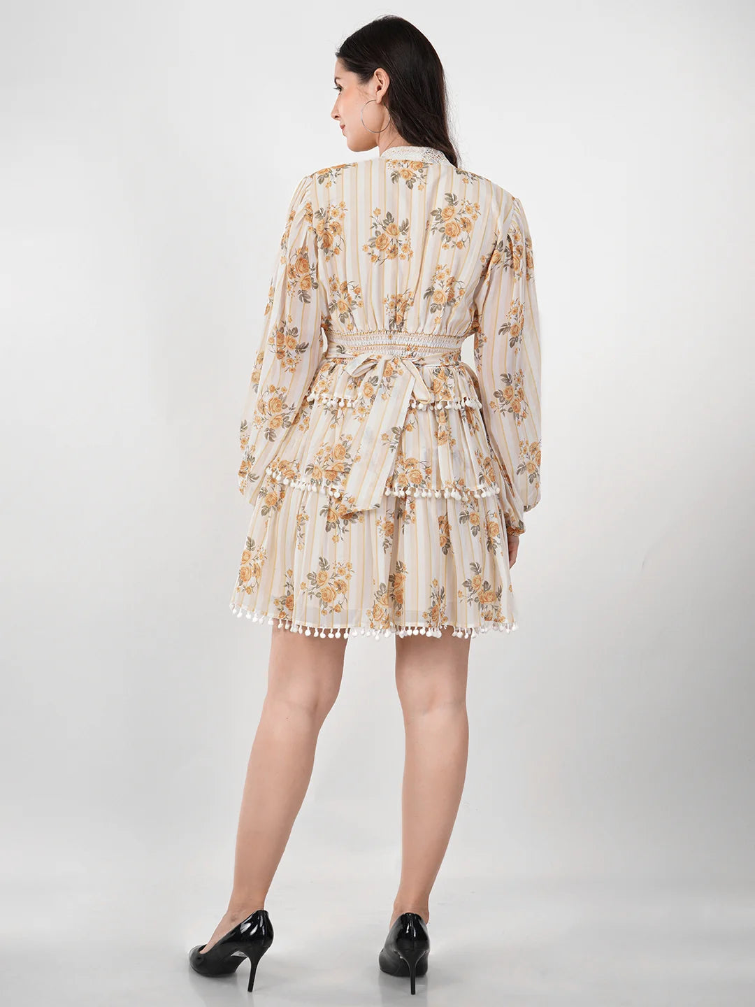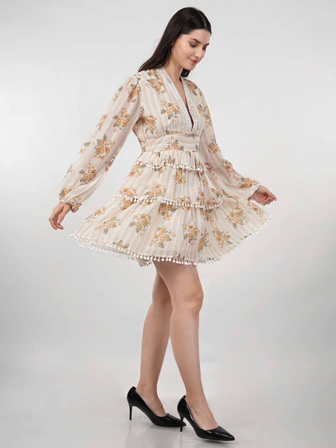 "PLUNGIN NECKLINE, PUFF FULL SLEEVES, LACE DETAILING, POM POM LACE, LAYERED DRESS, STRIPED FLORAL MINI DRESS, SMOCKED WAIST"