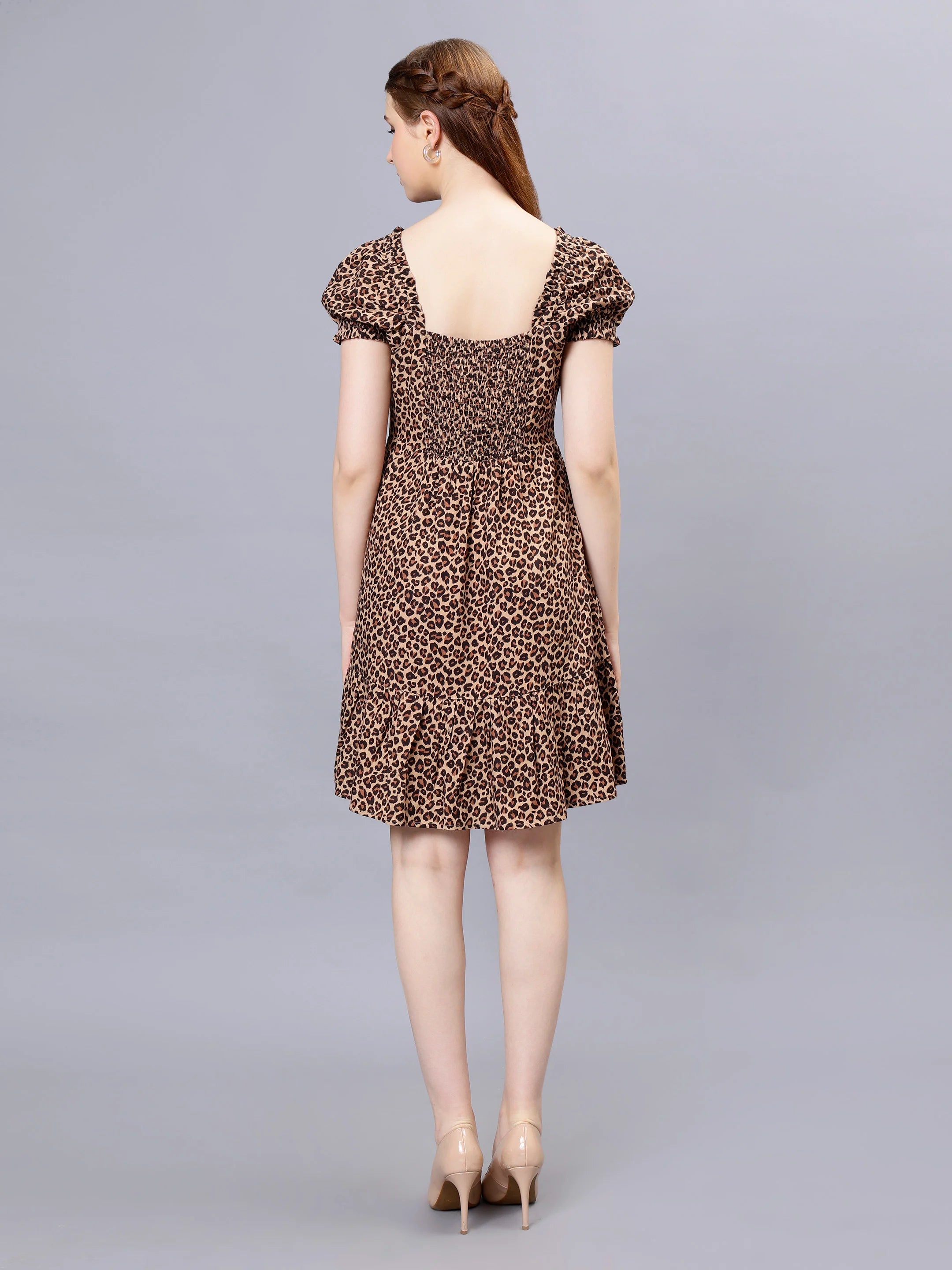 WOMEN'S LEOPARD PRINT SMOCKING RAYON MINI DRESS